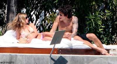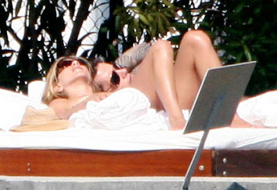 Dressed in a skimpy white bikini, the 39-year-old was caught cuddling up to the tattooed musician - nine years her junior - on a giant sunbed at her exclusive hotel while on a break from filming her new comedy Marley & Me.